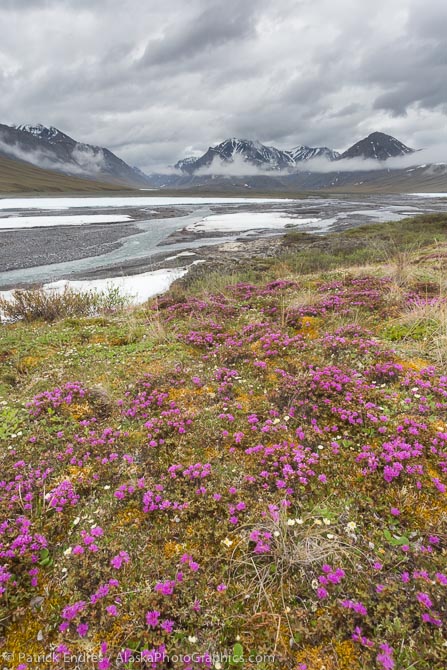 Day 5, June 18, 2014, 34 miles packrafting the Ivishak River. A 7-day, 170-mile wilderness backpack, and packraft trip along the Ribdon, Ivishak, and Sagavanirktok rivers in Alaska’s Brooks Range from June 14-20. The spring-blooming flowers beautifully colored our campsite on the tundra bench by the river. Namely Lapland rosebay, bright pink, and mountain aven, the ubiquitous blooming white…
