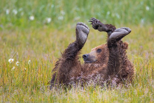 An open grassy meadow, with white daisies dotting the perimeter serves as a good spot for this brown bear to scratch its back by rolling around on the surface. I liked the display of both the pads of the bear’s feet, and its long, distinctive claws. Those claws can do some serious dirt removal, in…