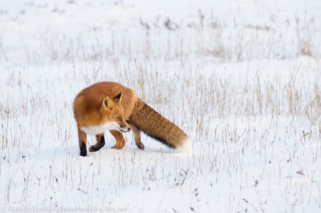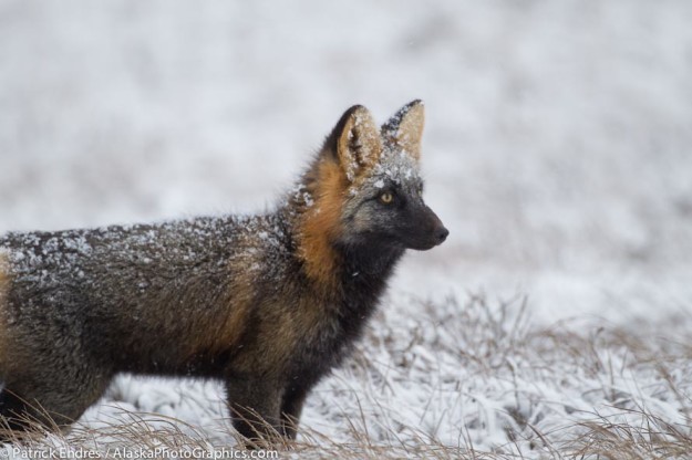 The tundra of Alaska’s arctic coast is hunted frequently by birds and fox, in particular, looking for rodents. I watched this red fox (in an cross fox color phase-its actually the same species just a variation in color), catch a number of rodents in a very short time. The fresh fallen snow is a contrasting…