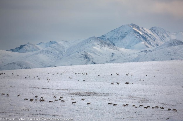 The nomadic caribou of Alaska’s arctic roam widely across the northern regions of the Brooks Range mountains. Several thousands were visible along the snowy tundra near the Philip Smith mountains, and I experimented with various focal lengths. They were quite far off but the herd shows their dispersion well. At least two in one group…